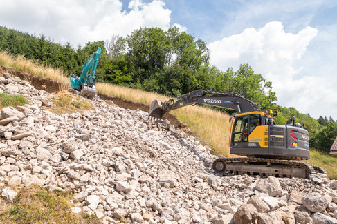 📍 Le jour de notre visite : mise en place de matériaux drainants 50/300 dans la loupe de glissement.